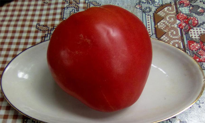 | Puuviljade omadused | Viljad on sügavroosad, kerge vaarika varjundiga. Õige põllumajandustehnoloogia ja õigeaegse hoolduse korral ulatub vilja keskmine kaal 1 kg-ni. Viljad on lihakad, magusad, rikkaliku tomatimaitsega. Tomateid kasutatakse tomatimahla valmistamiseks ja rullimiseks. |
